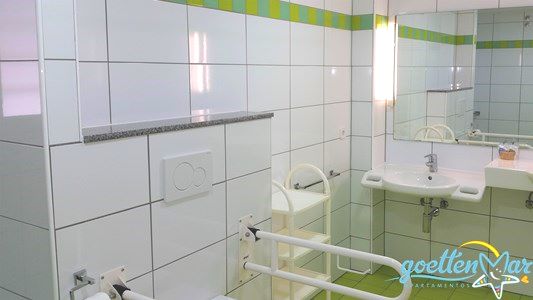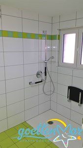 Befahren können Sie die Wohnung ebenerdig über die Terrasse. Das Bad ist so gebaut, dass Sie es mit dem Rollstuhl befahren können, ebenso die Dusche. Natürlich wurde auch an die Toilette gedacht. Eines der zwei Waschbecken ist barrierefrei, niedriger angebracht und kann unterfahren werden.